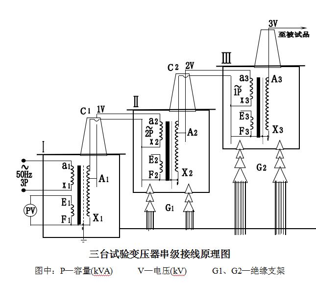 在上圖中,在第一級和第二級的每個(gè)單元試驗(yàn)變壓器中都有一個(gè)勵(lì)磁繞組A1、C1和A2、C2。在三臺(tái)串級試驗(yàn)變壓器基本原理中,低壓電源加在試驗(yàn)變壓器Ⅰ的初級繞組a1x1上,單臺(tái)試驗(yàn)變壓器Ⅰ、Ⅱ、Ⅲ的輸出電壓都是V。勵(lì)磁繞組A1、C1給第二級試驗(yàn)變壓器Ⅱ的初級繞組供電;第二級試驗(yàn)變壓器Ⅱ的勵(lì)磁繞組A2、C2給第三級試驗(yàn)變壓器Ⅲ的初級繞組供電。第二級試驗(yàn)變壓器Ⅱ和第三級試驗(yàn)變壓器Ⅲ的箱體分別處在對地為1V和2V的高電位上,所以箱體對地是絕緣的,試驗(yàn)變壓器Ⅰ的箱體是接地的。這樣第一級、第二級、第三級試驗(yàn)變壓器對地的額定輸出電壓分別為1V、2V、3V;其額定容量分別為3P、2P、1P。