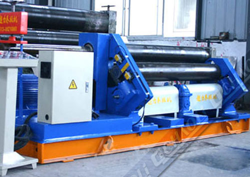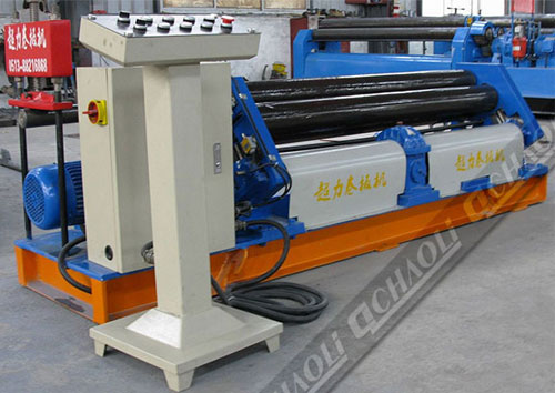 該機結構型式為三輥非對稱式,下輥為主傳動,并做垂直升降運動,以便夾緊板材。通過下輥齒輪與上輥齒輪嚙合,同時作為主傳動,側(cè)輥作傾升降運動。具有預彎、卷圓多重功能,結構緊湊操作維修方便。